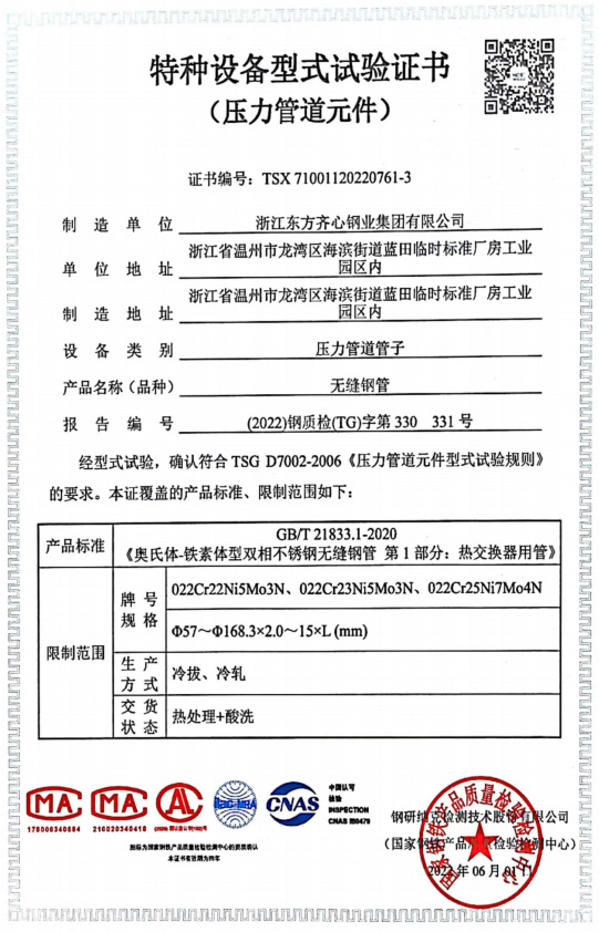 浙江東方齊心以不銹鋼系列產(chǎn)品為主導,品種有不銹鋼管、奧氏體不銹鋼管、高溫合金鋼管、雙相不銹鋼管、鎳基合金管、冷凝器用管、U形管、核電管、不銹鋼管件、法蘭、閥門等。規(guī)格有6-2020x0.8-60mm,Ф16-25長度可達33m。公司擁有精密制造鋼管的各類機械設備25臺(套),其中各類冷軋管機15臺, 冷拔機10臺,天然氣熱處理爐2套。